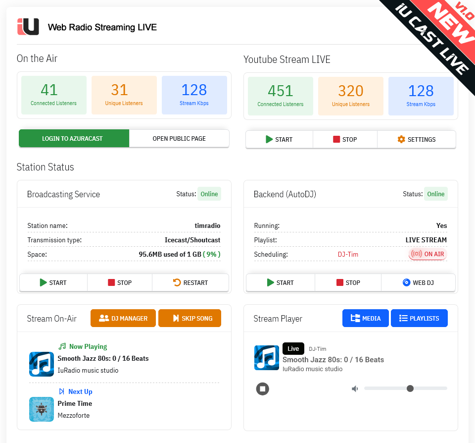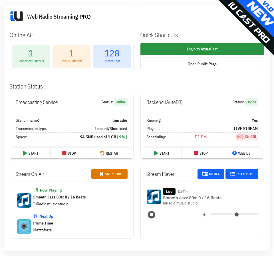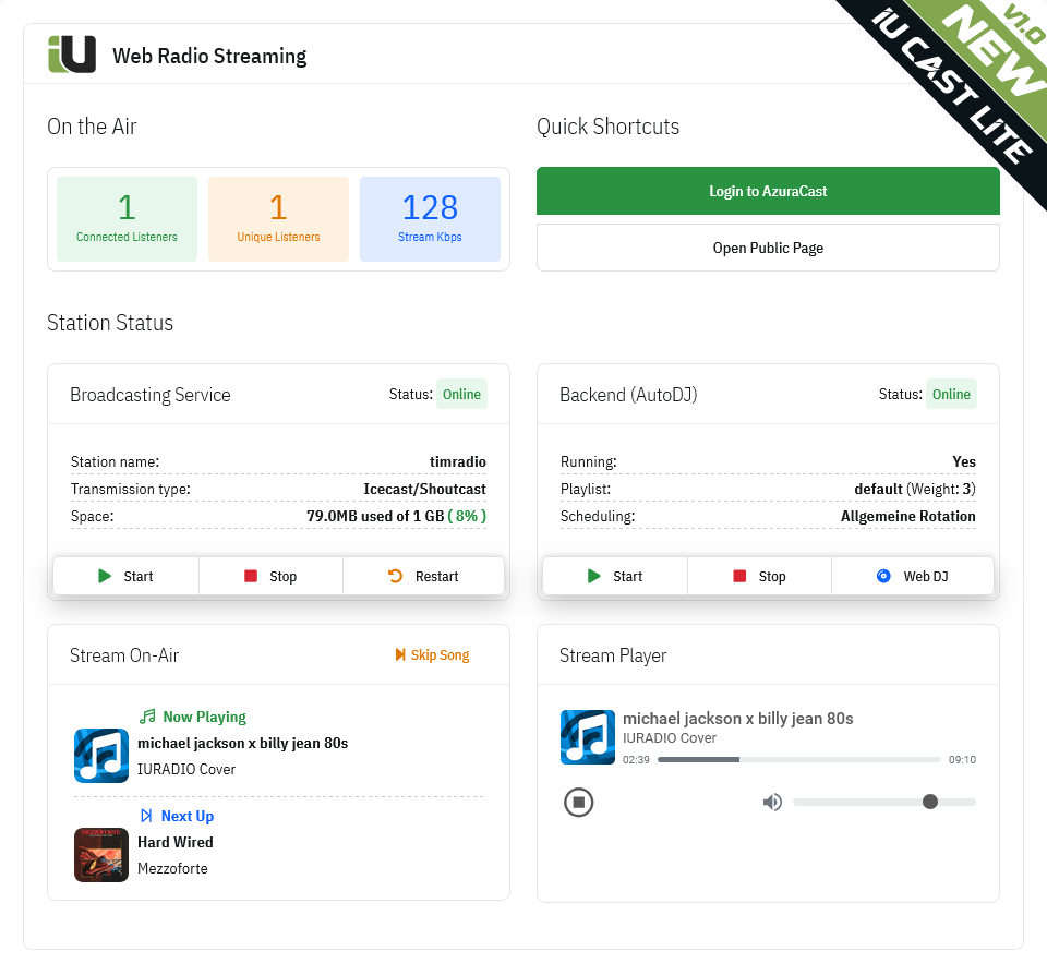 AzuraCast ist eine leistungsstarke, benutzerfreundliche Lösung für alle, die ein eigenes Web Radio betreiben möchten. Mit umfangreichen Frontend-Funktionen für Hörer und einem leistungsstarken Adminpanel für Betreiber bietet es alles, was man für einen professionellen Radio-Betrieb benötigt. Die erweiterte AutoDJ-Steuerung und YouTube-Streams Integration ab Version 1.3.0 unterstreichen die kontinuierliche Weiterentwicklung und Anpassungsfähigkeit der Plattform.